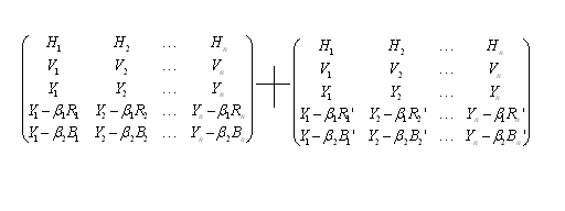 而現在的偽立體電視是由行向量H,幀向量V,亮度向量Y組成的三維線性空間。表達彩色信息的是由紅向量R,R',綠向量G,G',蘭向量B,B'組成的。共有H,V,Y,R,G,B,R',G',B'九個向量,通過不同的線性組合,組成的三維線性空間。可用以下左右二個的矩陣來表示: