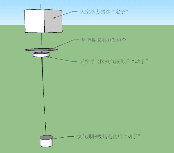 如上圖所示:設(shè)計一種系統(tǒng),在地面的時候“動子”里面的物質(zhì)呈氣態(tài),而且單位體積明顯輕于空氣,就會形成比較大的浮力,使“動子”具有上升的趨勢,放開“動子”任其在浮力下,自由上升,當上升到一定高度后,“動子”內(nèi)的氣體由于溫度明顯下降而液化成液體,這時浮力消失,“動子”在重力作用下會快速下落。這就形成了一個利用熱能、勢能、動能之間相互轉(zhuǎn)化而形成的一個“永動系統(tǒng)”而且能從外界獲取可觀能源來發(fā)電。只要做出“動子”上升時保溫,上升到一定高度后能自由撤銷保溫狀態(tài)進行熱交換就可以了。