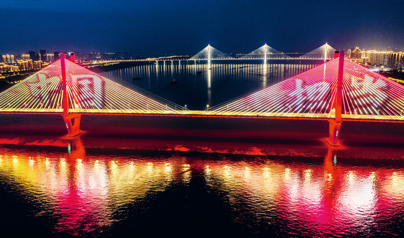 在抗擊新冠肺炎疫情的斗爭中,中國人民萬眾一心、眾志成城,凝聚起強大合力,展現了中國力量、中國精神、中國效率。圖為2020年5月2日晚,湖北武漢長江二橋燈光秀打出的“中國擔當”畫面。 中新社發 趙廣亮/攝
